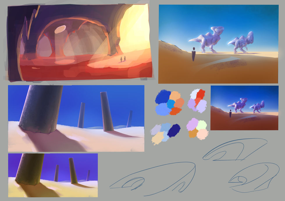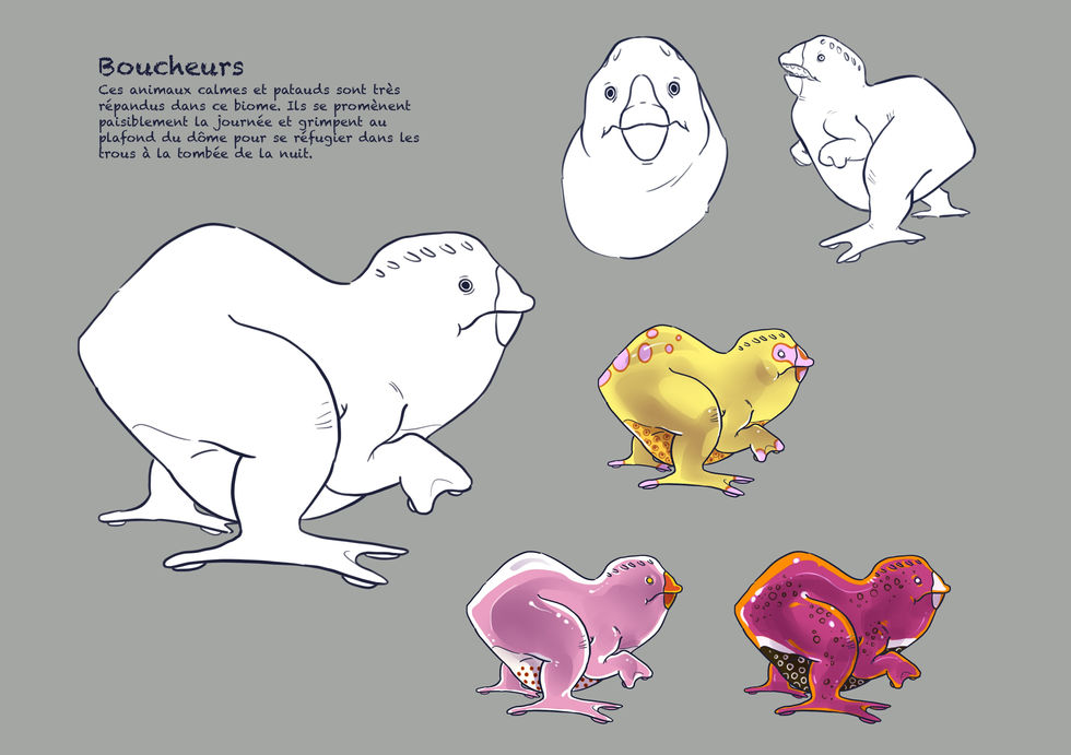 Pour me poser un cadre professionnel durant la conception du projet, je me suis mise dans la peau d'une Vis Dev ( visual development artist ), j'ai donc décidé de réaliser les dessins, recherches, propositions, déclinaisons qui seraient destinés à servir de visuels pour un potentiel projet d'animation.